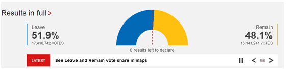 據BBC新聞報道,英國當地時間6月24日上午7點,英國脫歐公投所有計票全部結束,最終的結果鎖定在了51.9%支持脫離歐盟,48.1%的票數選擇留在歐盟,雙方陣營之間票數差距達到近130萬。至此,英國脫歐公投塵埃落定,在脫歐和留歐陣營之間反反復復進行了一年有余的拉鋸戰終于敲定。