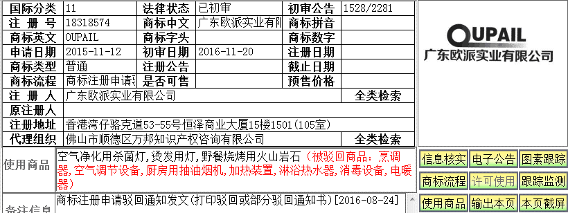 名為“廣東歐派實業有限公司”的香港企業在11類申請注冊“OUPAIL”商標并已通過初審。