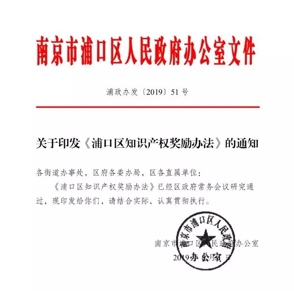 2019年南京市浦口區知識產權獎勵辦法:首件發明專利獎勵5000元