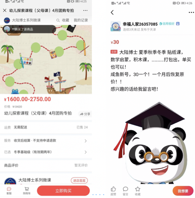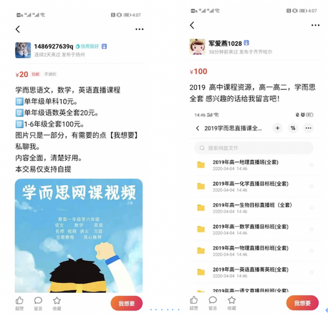 今日,筆者經閑魚二手交易平臺中搜索“學而思”、“好奇星創意機械課”、“大陸博士”等關鍵詞時,發現了大量低價的盜版在線教育資源。