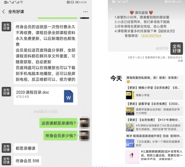 而進一步和“全布好課”聊天,很多新的課程資源是他購買后進行翻錄,超級會員費用為598元,不打折。像“全部好課”的這樣微信經營者很多,他們依靠長期積攢的盜版在線教育資源,通過“眾籌”、“會員”等模式進行非法獲利,并通過百度網盤群等進行非法傳播,傳播范圍及受損失的在線交易企業的數量等危害都遠超單個盜版資源傳播帶來的影響。